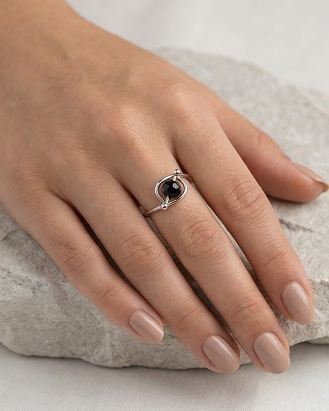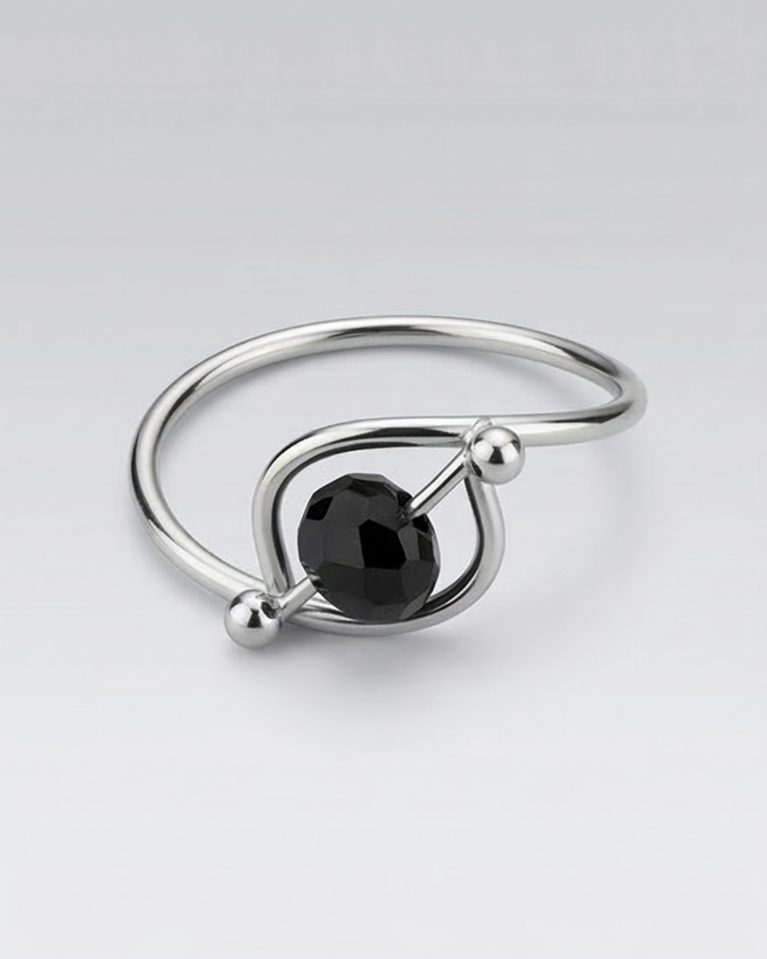 Make a bold, minimalist statement with the Black Crystal Orbit Bypass Ring. This artificial jewelry piece is a perfect example of contemporary structural design, moving away from traditional settings to create a wearable piece of art. The ring features an open, geometric frame that surrounds a brilliant jet-black faceted crystal. The stone is mounted on a diagonal cross-bar, catching the light from every angle to reveal its multifaceted fire.