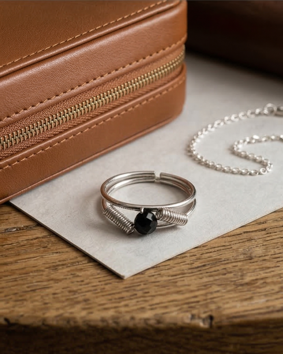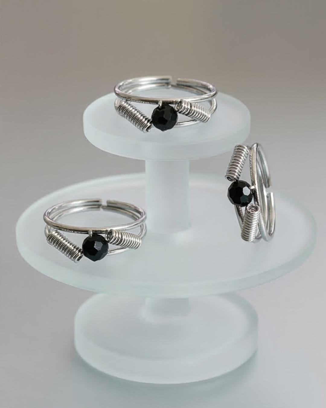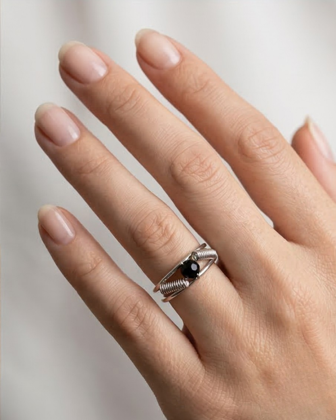 Make a sophisticated statement with the Black Crystal Solitaire Ribbed Ring. This piece of artificial jewelry is a masterclass in modern minimalist design, combining clean lines with unexpected textures. The focal point is a jet-black faceted crystal, which is elegantly offset by two silver-tone ribbed accents that give the ring an industrial yet refined character.