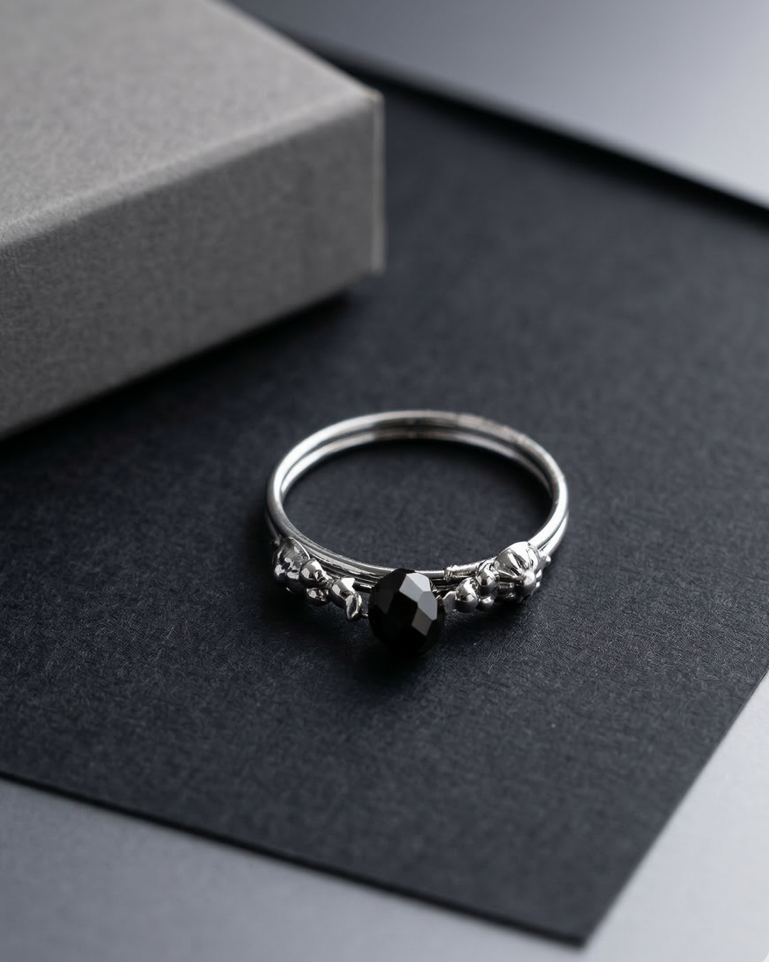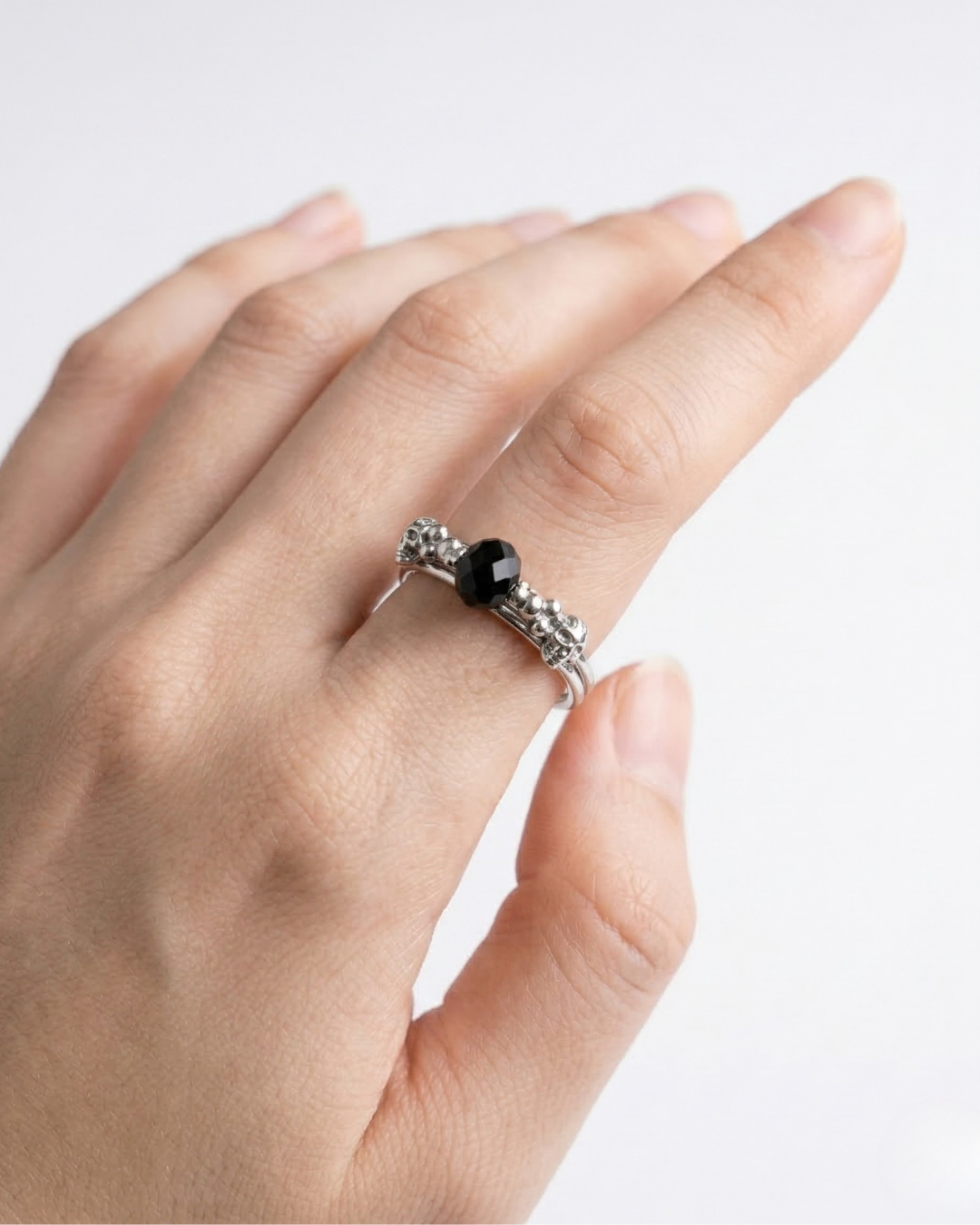 Add a touch of mysterious elegance to your hand with the Black Crystal Solitaire Stacking Ring. This artificial jewelry piece stands out through its blend of textures and tones. At its center sits a faceted jet-black crystal, held in a low-profile setting that makes it ideal for daily wear. The band itself is a work of art, featuring a series of tiny embossed silver-tone spheres and organic shapes that give the ring a vintage, artisanal character.