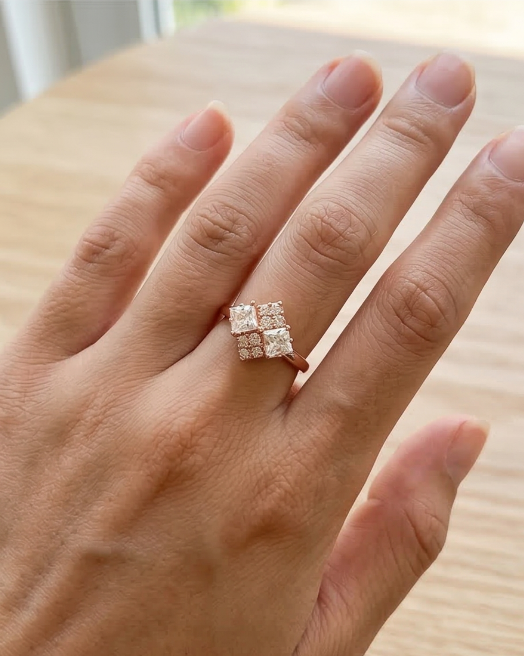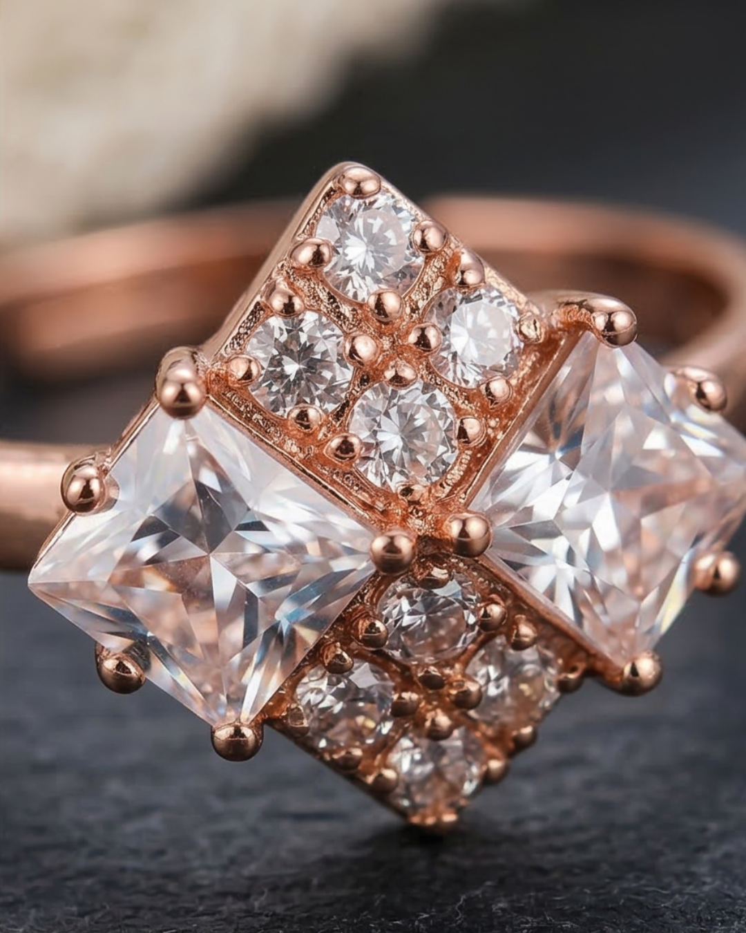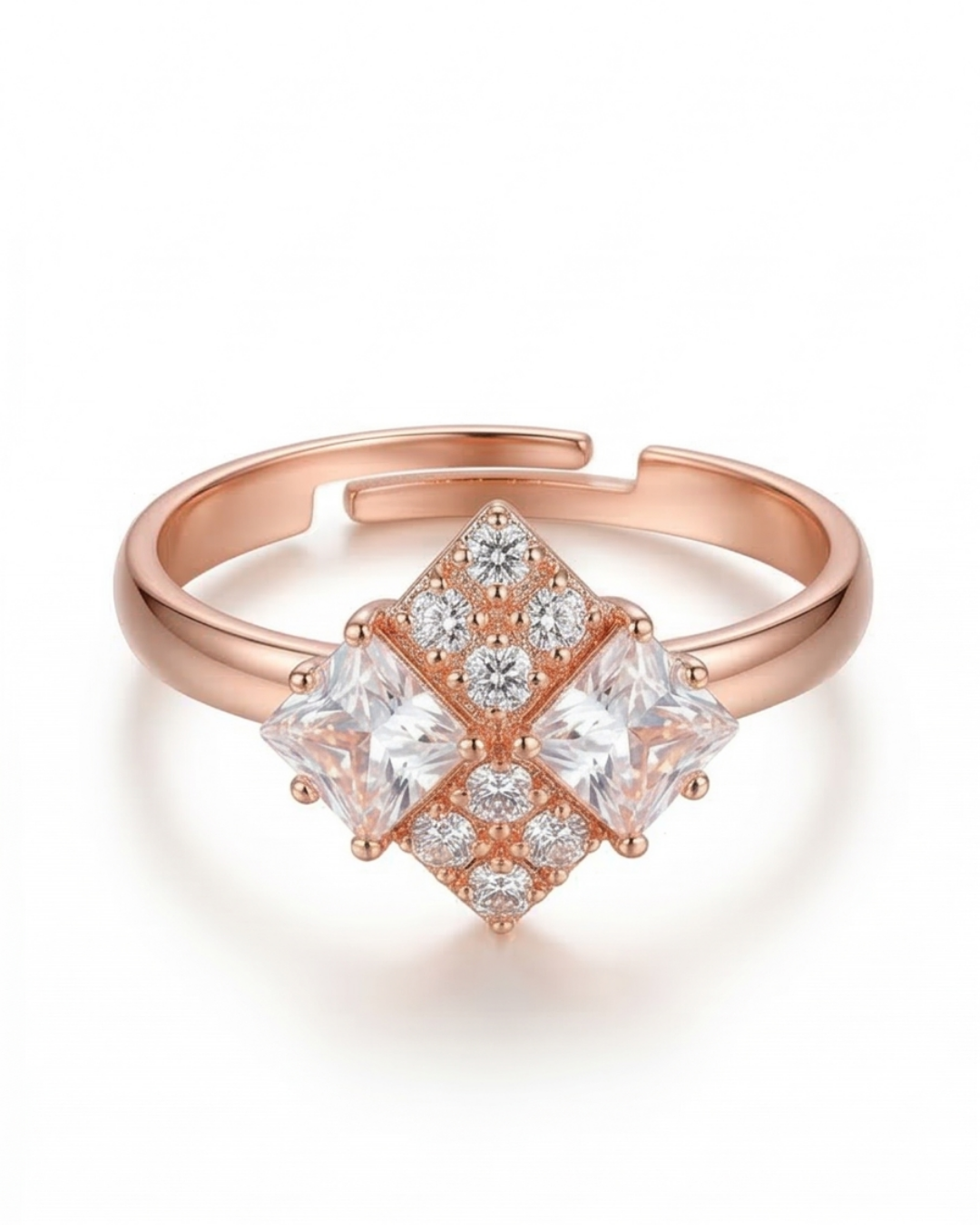Add a touch of contemporary elegance to your hand with the Adjustable Rose Gold Rhombus Cluster Ring. This artificial jewelry piece masterfully balances modern geometric lines with a romantic rose gold finish. The central rhombus motif is meticulously set with a cluster of multifaceted stones that mimic the fire of high-end diamonds, providing the illusion of grandeur at an affordable price. Its open-back design makes it an ideal, worry-free gift, as it can be gently customized to fit securely on any finger. Perfect for adding a sophisticated shimmer to both casual and party wear.