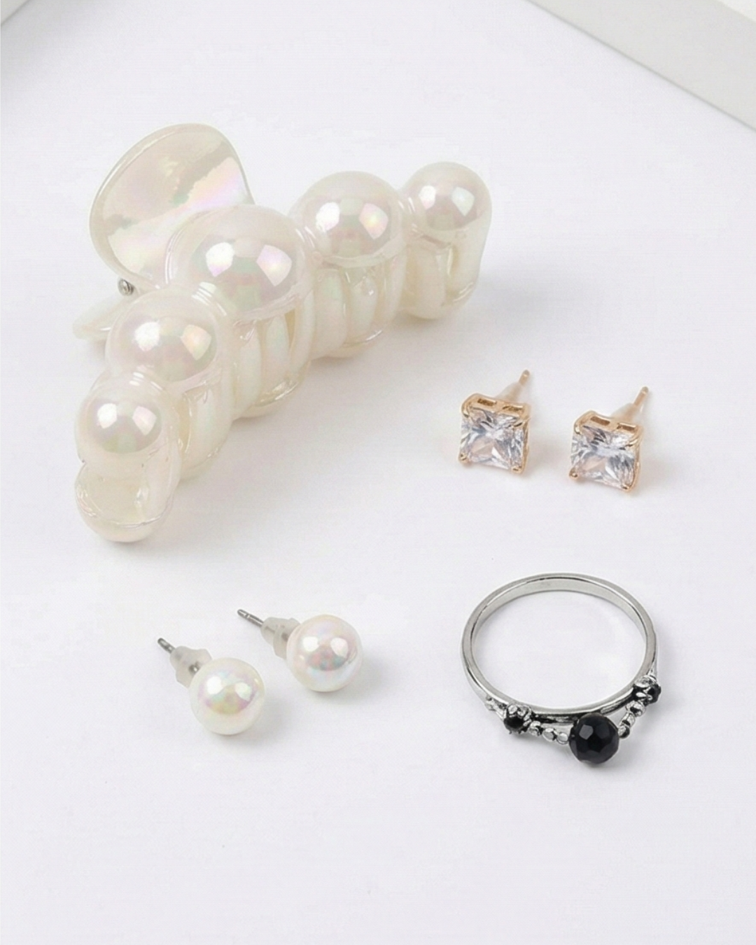 • Combo Includes: 1 Pearl Claw Clip, 2 Pairs of Stud Earrings, 1 Ring.